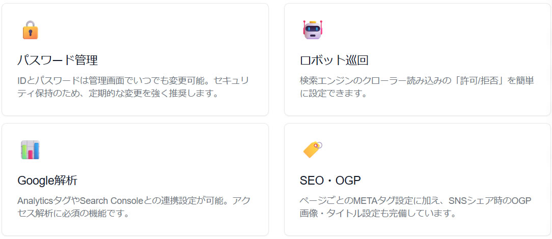 安全な運用と、Google等の外部ツールとの連携も「基本設定」から一元管理できます。